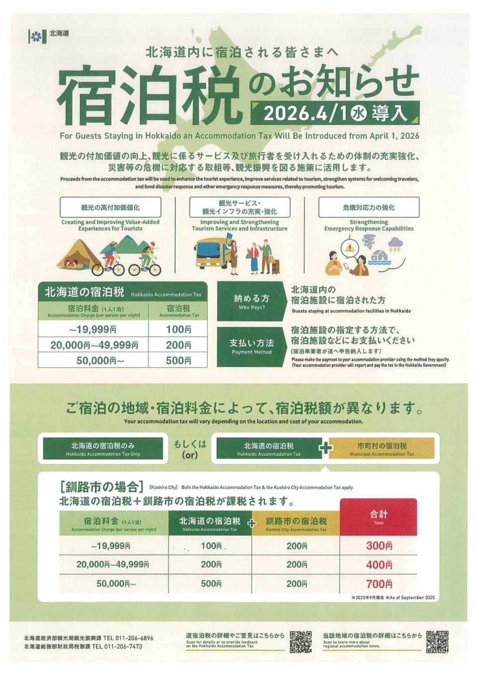 2026年4月1日からは、北海道でも宿泊税が導入されるため、釧路市宿泊税と合わせてご負担いただくことになります。